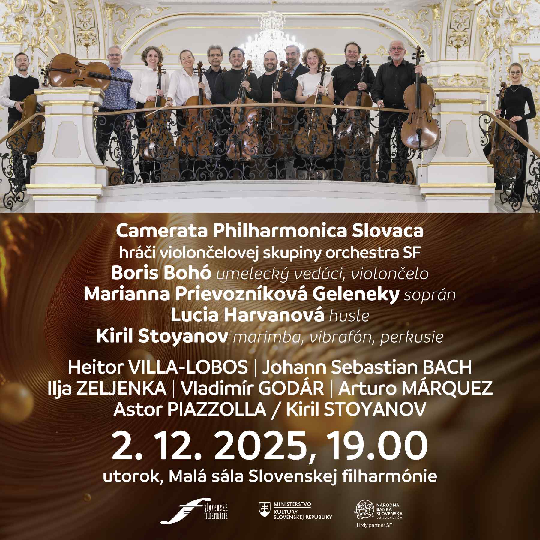Tentokrát vás na koncert pozývajú členovia violončelovej skupiny orchestra SF. Ich hosťami budú sopranistka Marianna Prievozníková Geleneky, huslistka Lucia Harvanová a hráč na marimbu, vibrafón a perkusie Kiril Stoyanov. Koncert sa bude konať v Malej sále Slovenskej filharmónie v utorok 2. decembra 2025 o 19.00.