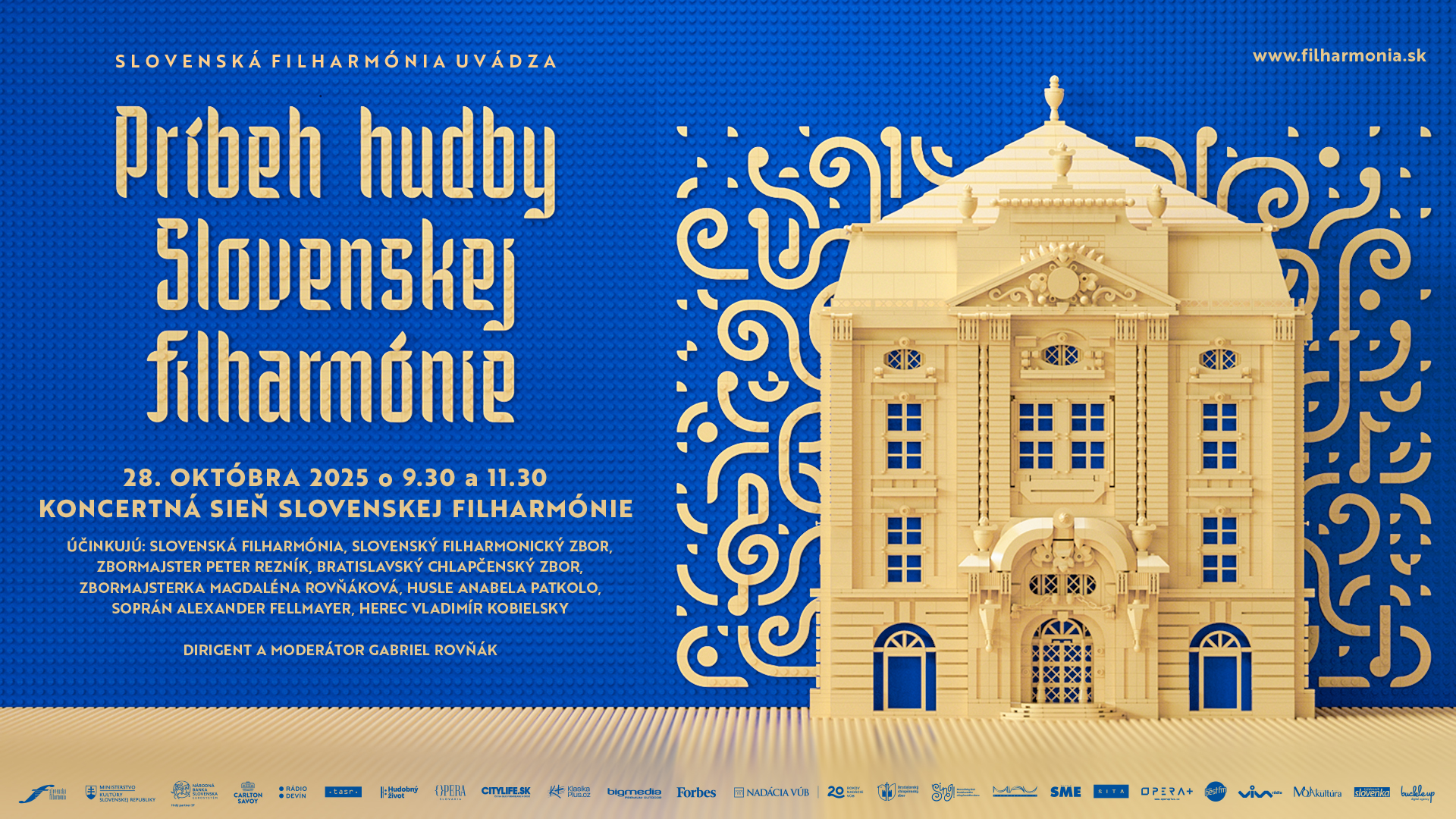 Deti a mladí poslucháči sa na koncertoch dozvedia o vzniku prvej slovenskej hudobnej inštitúcie. Spoločne budeme cestovať v čase, do roku 1949, kedy vznikal orchester a zakladala sa Slovenská filharmónia. Tešiť sa môžete na stretnutie s hudobným skladateľom, profesorom Eugenom Suchoňom, zakladateľom Slovenskej filharmónie. Je to neuveriteľné, ale spoločne navštívime aj prvý koncert, ktorý zaznel 27. októbra 1949. Mladí návštevníci si vypočujú diela viacerých skladateľov – Alexandra Moyzesa, Jána Cikkera, Eugena Suchoňa, Franza Schuberta, Ludwiga van Beethovena a Vladimíra Godára. Mladí sa stretnú s členmi našich telies – orchestra Slovenská filharmónia, Slovenského filharmonického zboru a so zbormajstrom Petrom Rezníkom. Dozvedia sa, že v Slovenskej filharmónii sa narodil aj Chlapčenský filharmonický zbor, ktorý dnes poznáme ako Bratislavský chlapčenský zbor. Deti sa dozvedia, ako sa stať členom Slovenskej filharmónie - zažijú konkurz a sami rozhodnú, kto v ňom uspeje. Odvážni sa stanú na malú chvíľu Filharmonikmi. V Koncertnej sieni Slovenskej filharmónie vás čaká mnoho hudby a zábavy. V Príbehu hudby Slovenskej filharmónie budú pod taktovkou Gabriela Rovňáka účinkovať Slovenská filharmónia, Slovenský filharmonický zbor (zbormajster Peter Rezník), Bratislavský chlapčenský zbor (zbormajsterka Magdaléna Rovňáková), herec Vladimír Kobielsky , huslistka Anabela Patkoló a člen Bratislavského chlapčenského zboru Alexander Fellmayer. Tešíme sa na vás na Príbehu hudby Slovenskej filharmónie v 77. koncertnej sezóne SF!