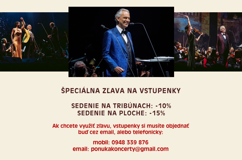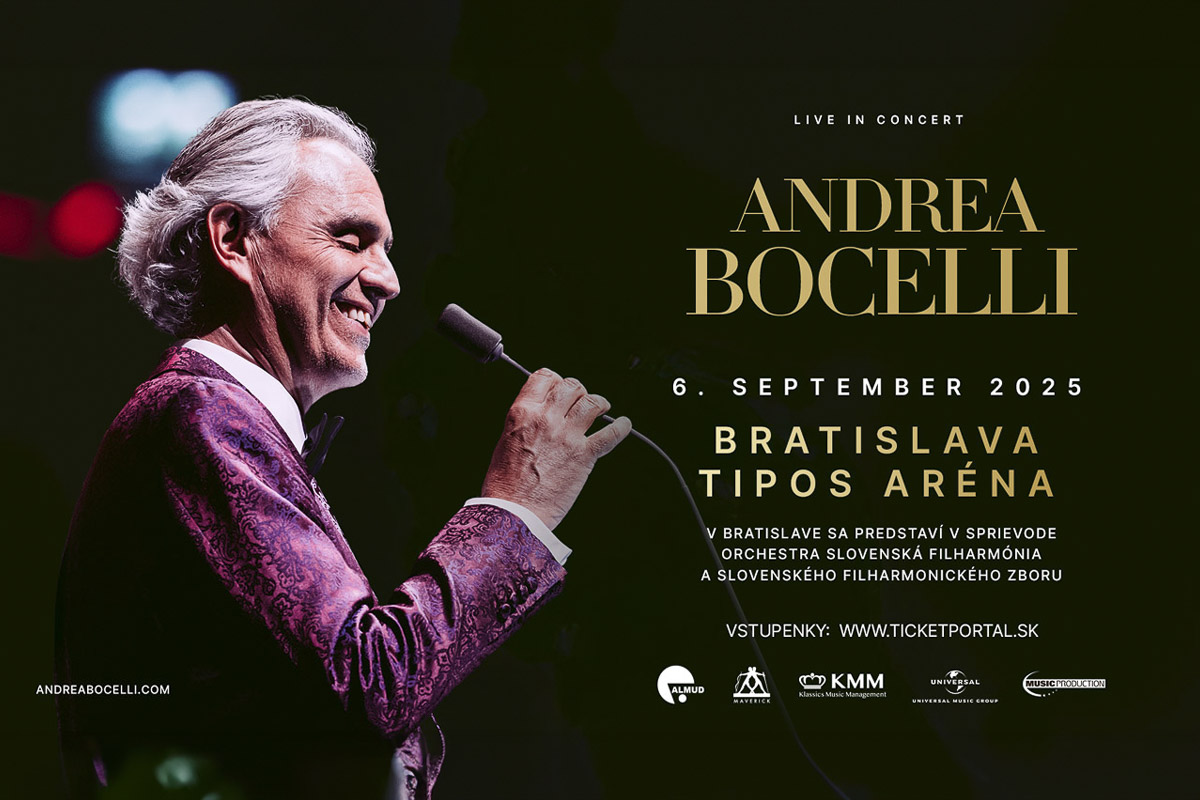 Maestro Andrea Bocelli svojím hlasom dojíma milióny ľudí po celom svete. Už 6. septembra 2025 očarí návštevníkov koncertu v bratislavskej Tipos aréne. Sprevádzať ho bude orchester Slovenská filharmónia a Slovenský filharmonický zbor. Vystúpia s nim ďalší hostia - husľová virtuózka s medzinárodným renomé Rusanda Panfili, ktorá svoj najnovší LP album LIBERTANGO predstavila v Bratislave, medzinárodne uznávaná sopranistka Cristina Pasaroiu, ktorá sa pred septembrovým koncertom v Bratislave predstaví ako Violetta Valéry vo Verdiho opere La traviata v rámci Viedenského operného leta v zámockom parku Belvedere a dánska speváčka Andrea Lykke. Atmosféru večera umocnia choreografie dvoch talianskych tanečníkov – Francesca Costu a Angeliky Gismondo. Koncert zaznie pod taktovkou Taliana Marcella Rotu.