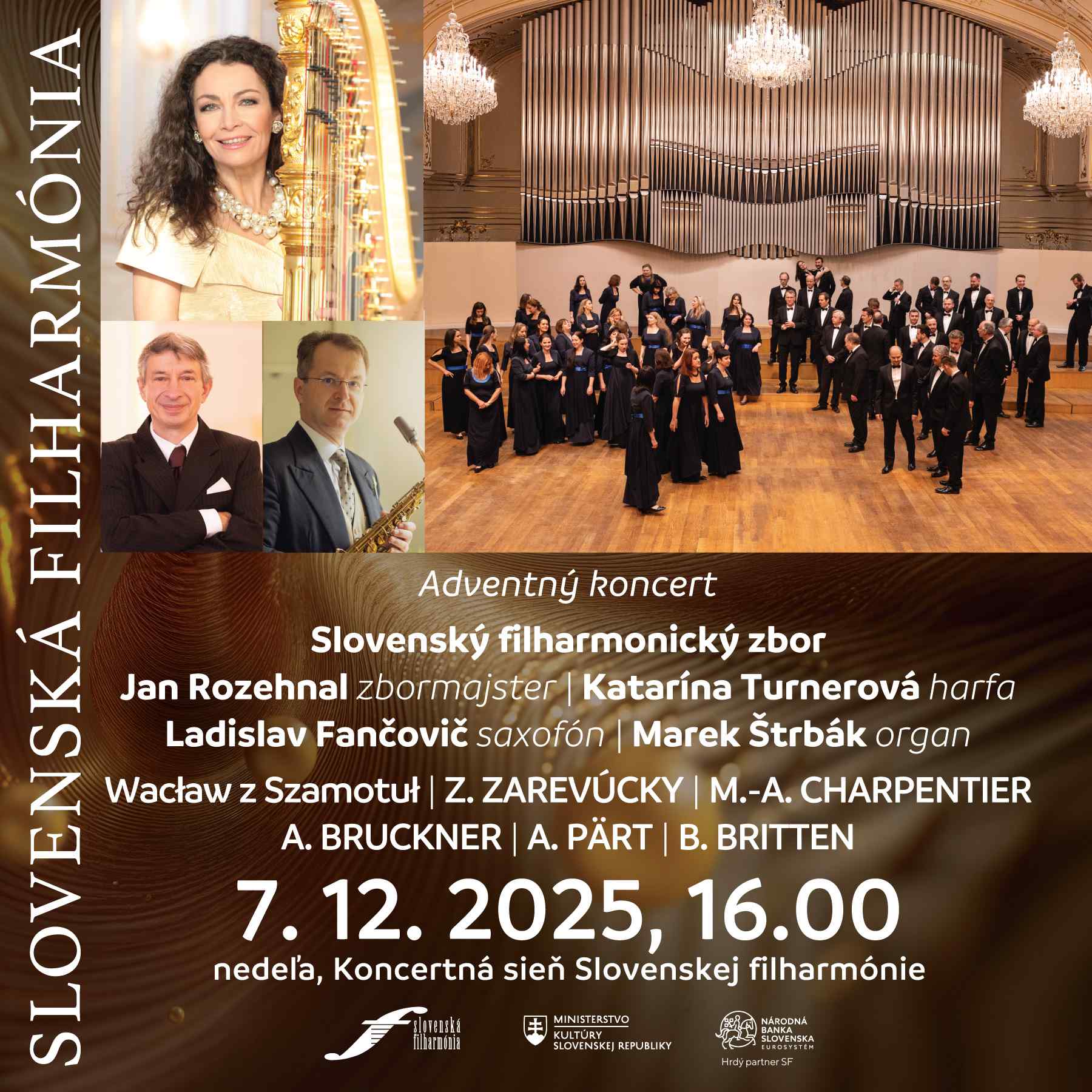 Nedeľa 7. decembra o 16.00 bude patriť Slovenskému filharmonickému zboru a zbormajstrovi Janovi Rozehnalovi. Po boku nášho fenomenálneho telesa sa predstavia viacerí interpreti – sólo harfistka orchestra SF Katarína Turnerová, multiištrumentalista Ladislav Fančovič a organista Marek Štrbák.
