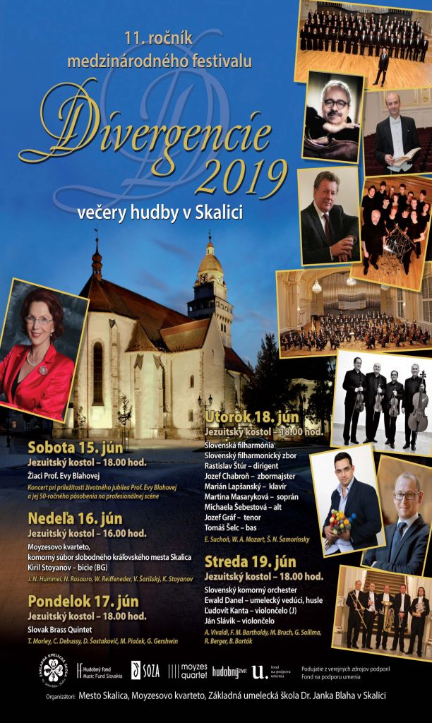 Telesá Slovenskej filharmónie – Slovenská filharmónia, Slovenský filharmonický zbor, Slovenský komorný orchester, klavírny virtuóz Marian Lapšanský, gen. riaditeľ Slovenskej filharmónie a vokálni sólisti – Martina Masaryková, Michaela Šebestová, Jozef Gráf a Tomáš Šelc, violončelisti Ján Slávik, Ľudovít Kanta a stály hosťujúci dirigent SF Rastislav Štúr sa tento týždeň predstavia na festivale Divergencie v Skalici.Slovenská filharmónia a Slovenský filharmonický zbor uvedú program z diel Eugena Suchoňa Aká si mi krásna ESD 51b, Wolfganga Amadea Mozarta Koncert pre klavír a orchester č. 20 d mol, KV 466 a Štefana Németha-Šamorínského Bratislavská omša. 11. ročník festivalu uzavrie koncert Slovenského komorného orchestra, po boku ktorého vystúpia dvaja violončelisti Ján Slávik a Ľudovít Kanta. Komorný orchester uvedie program zostavený z diel - F. Mendelssohna- Bartholdho, Maxa Brucha, Romana Bergera a ďalších. Koncerty sa uskutočnia v Jezuitskom kostole v Skalici, v utorok a stredu 18. a 19. júna tohto roku o 18.00 h.