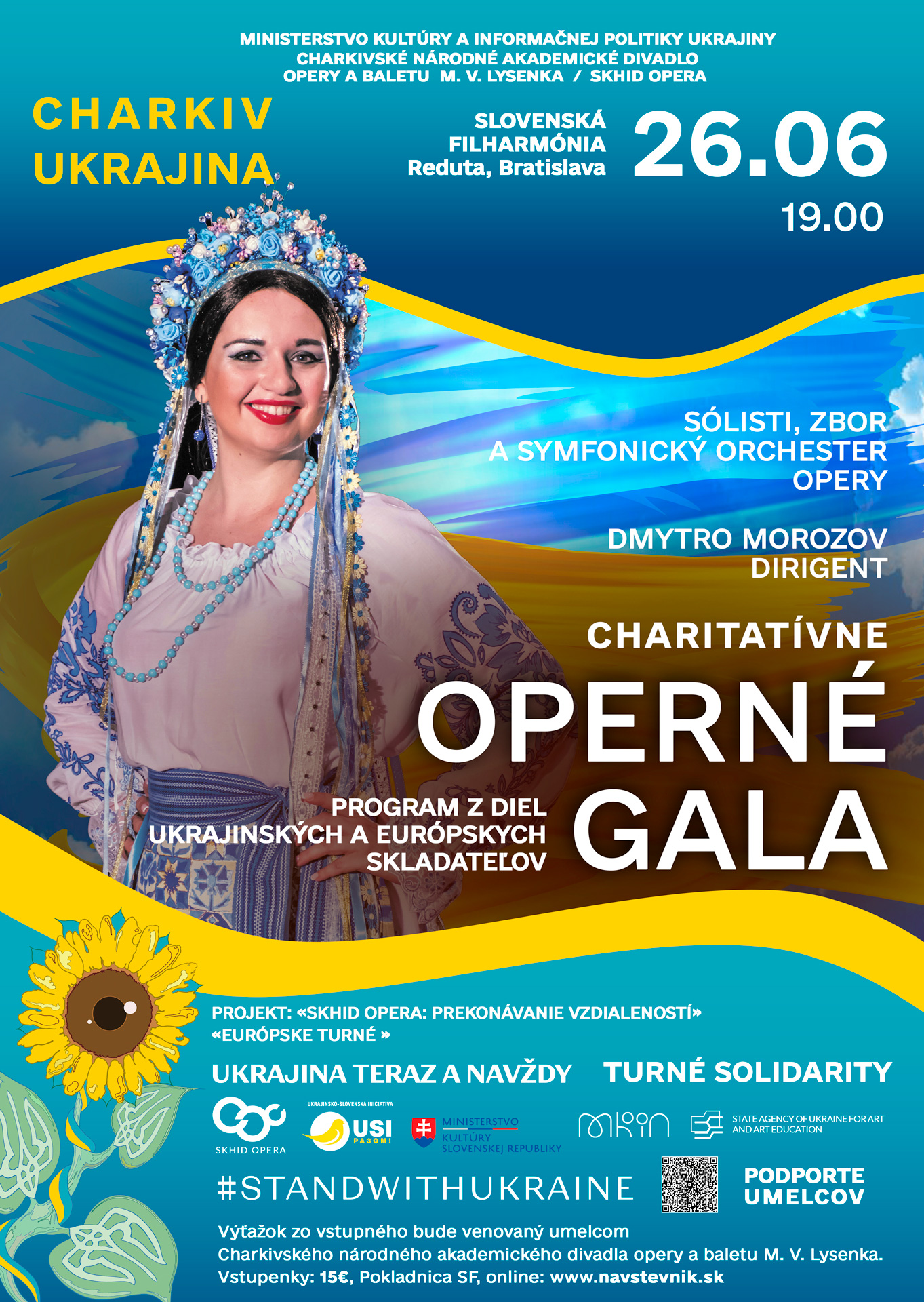 Slovenská filharmónia privíta v nedeľu 26. júna 2022 ukrajinských umelcov – členov symfonického orchestra, speváckeho zboru a operných sólistov Opery Východ z Charkiva, ktorí vystúpia pod taktovkou svojho šéfdirigenta, zaslúžilého umelca Ukrajiny Dmytra Morozova. Vojnová situácia v krajine umelcom nedovolí účinkovať na domovskej scéne v Charkivskom národnom akademickom divadle opery a baletu M. V. Lysenka / Opera Východ, ktorá bola založená v roku 1925. Je jedným z desiatich ukrajinských divadiel, ktoré získalo status „národného divadla“. V Slovenskej filharmónii sa predstaví 15 sólistov – zaslúžilý umelec Ukrajiny Volodymyr Kozlov, barytón, zaslúžilá umelkyňa Ukrajiny Olena Šyriajeva, soprán, Serhij Kryžnenko, bas, Julija Piskun, soprán, Serhij Zamycký, bas, Olesia Mišarina, soprán, Ihor Bondarenko, tenor, Julija Antonová, soprán, Oleksandr Zolotarenko, tenor, Anna Danič, mezzosoprán, zaslúžilý umelec Ukrajiny Serhij Hontovy, bas, Júlija Forsiuk, soprán Vjačeslav Strelkov, bas, Mykyta Marynčak, barytón, Roman Gordieiev, tenor.