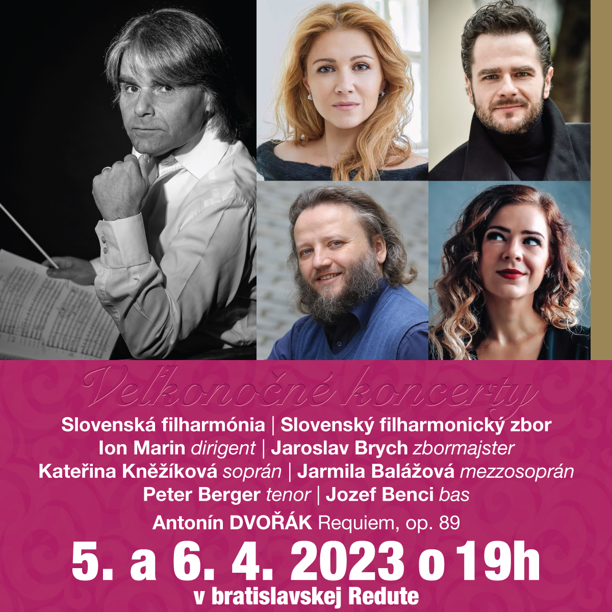 V stredu a vo štvrtok 5. a 6. apríla vystúpia v Koncertnej sieni Slovenskej filharmónie orchester Slovenská filharmónia, Slovenský filharmonický zbor (zbormajster Jaroslav Brych) a česko-slovenské kvarteto sólistov – Kateřina Kněžíková soprán, Jarmila Balážová mezzosoprán, Peter Berger tenor a Jozef Benci bas. V naštudovaní rumunsko-rakúskeho dirigenta Iona Marina zaznie v bratislavskej Redute Rekviem Antonína Dvořáka. Ion Marin vedie popredné svetové orchestre, pod jeho taktovkou spievali hviezdy opery ako Luciano Pavarotti či Plácido Domingo.