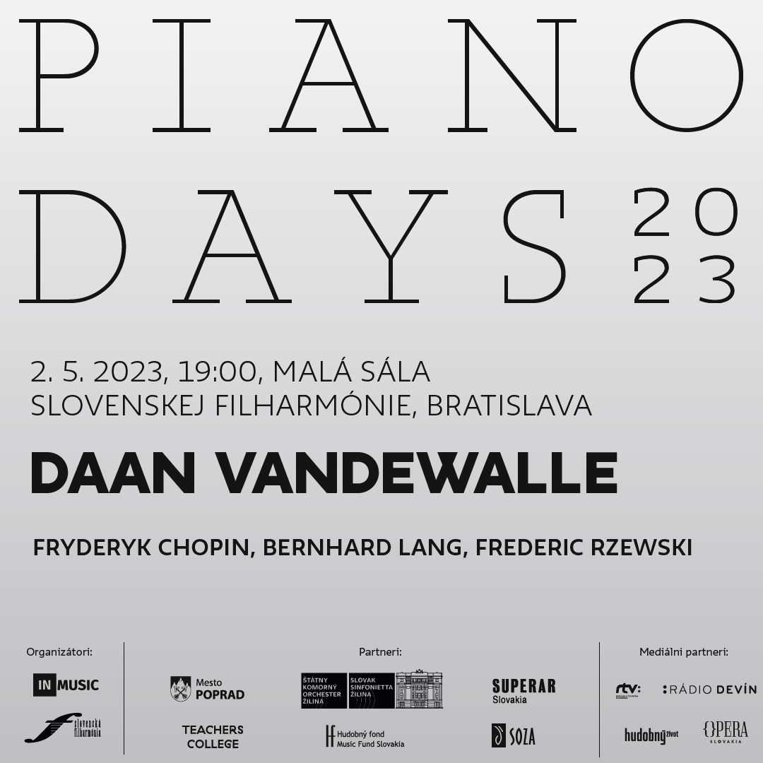 Utorkový koncert v Malej sále Slovenskej filharmónie je záverečným podujatím tretieho ročníka PIANO DAYS 2023. V interpretácii Belgičana Daana Vandewalleho zaznejú skladby Bernharda Langa, Fryderyka Chopina a Frederica Rzewskeho. Koncert s názvom Chopin vtedy a teraz spája tri mená skladateľov, ktoré na prvý pohľad spolu nesúvisia. Tvorba Fryderyka Chopina je dôležitým pilierom pre milovníkov klavírnej tvorby. Z jeho diel zaznie na utorkovom koncerte Uspávanka Des dur, op. 57 a 3 nové etudy, op. posth. V slovenskej premiére zaznejú diela Bernharda Langa a Frederica Rzewskeho, ktorí boli podobne ako Chopin klaviristi aj skladatelia. Langova kompozícia Monadologie XXXVI Chopin 12 etudes je akousi rekompozíciou Chopinových etúd. Rzewskeho skladba Rubinstein v Berlíne pre hovoriaceho klaviristu kombinuje príbeh klaviristu Arthura Rubinsteina s Nokturnom cis mol.