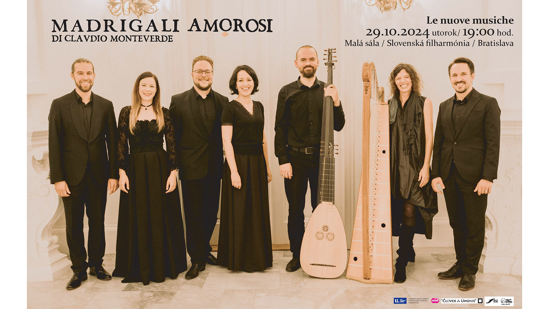 „Koncertný program súboru Le nuove musiche predstaví aj ďalšie známe ľúbostné madrigaly fenomenálneho skladateľa, ako napríklad rozpory vyvolávajúca Cruda Amarilli či ďalšie madrigaly z Monteverdiho 6. a 7. knihy. Návštevníci si vypočujú vývoj kompozičného štýlu skladateľa od polyfónnych diel bez sprievodu bassa continua až po jeho dramatické a mimoriadne expresívne diela v stille concitato či stille rappresentativo. Monteverdiho dielo bude interpretovať päť vynikajúcich českých a slovenských vokálnych sólistov, špecialistov na oblasť starej hudby. Baroková gitara a viola da gamba bude v rukách Pierra Pitza, odchovanca a dnes už pedagóga oddelenia starej hudby Hochschule für Musik und darstellende Kunst vo Viedni. Medzinárodné obsadenie zoskupenia rozširuje harfista Maximilian Ehrhardt, absolvent Konzervatória v Amsterdame i akadémie v Miláne. Ansámbel povedie Jakub Mitrík, skúsený teorbista, lutnista i gitarista, vďaka ktorému v poslednom desaťročí ožilo na slovenských pódiách viacero zabudnutých domácich i zahraničných diel,“ pozýva na utorkový koncert dramaturgička komorných koncertov SF Kristína Gotthardtová.