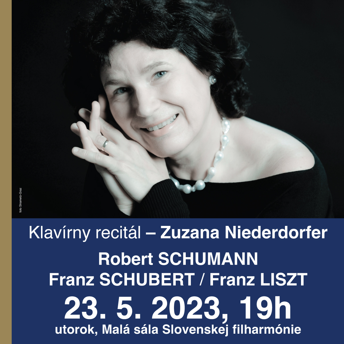 V utorok 23. mája 2023  sa v Slovenskej filharmónii uskutoční záverečný koncert cyklu Klavír a klaviristi. V Malej sále Slovenskej filharmónie sa predstaví popredná  slovenská klaviristka, pôsobiaca v Grazi, Zuzana Niederdorfer. Koncert sa začne o 19.00.